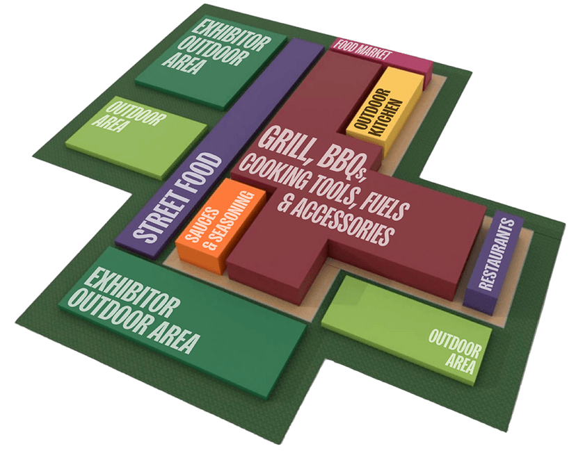 Que vous soyez là pour flâner, tester, acheter… ou signer des deals, le plan vous guide à travers les grands univers du salon : BBQ & matériel, accessoires & équipements, combustibles (charbon, bois, pellets…), sauces & épices, cuisines et aménagement d’extérieur, ainsi qu’une sélection d’épicerie fine.